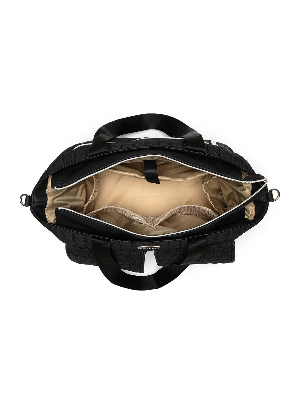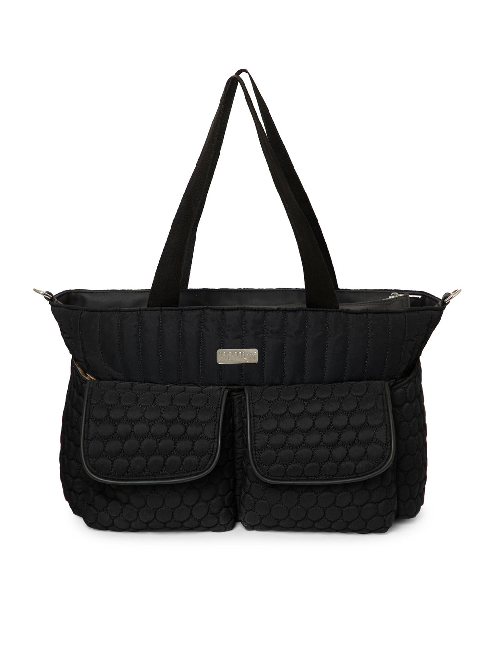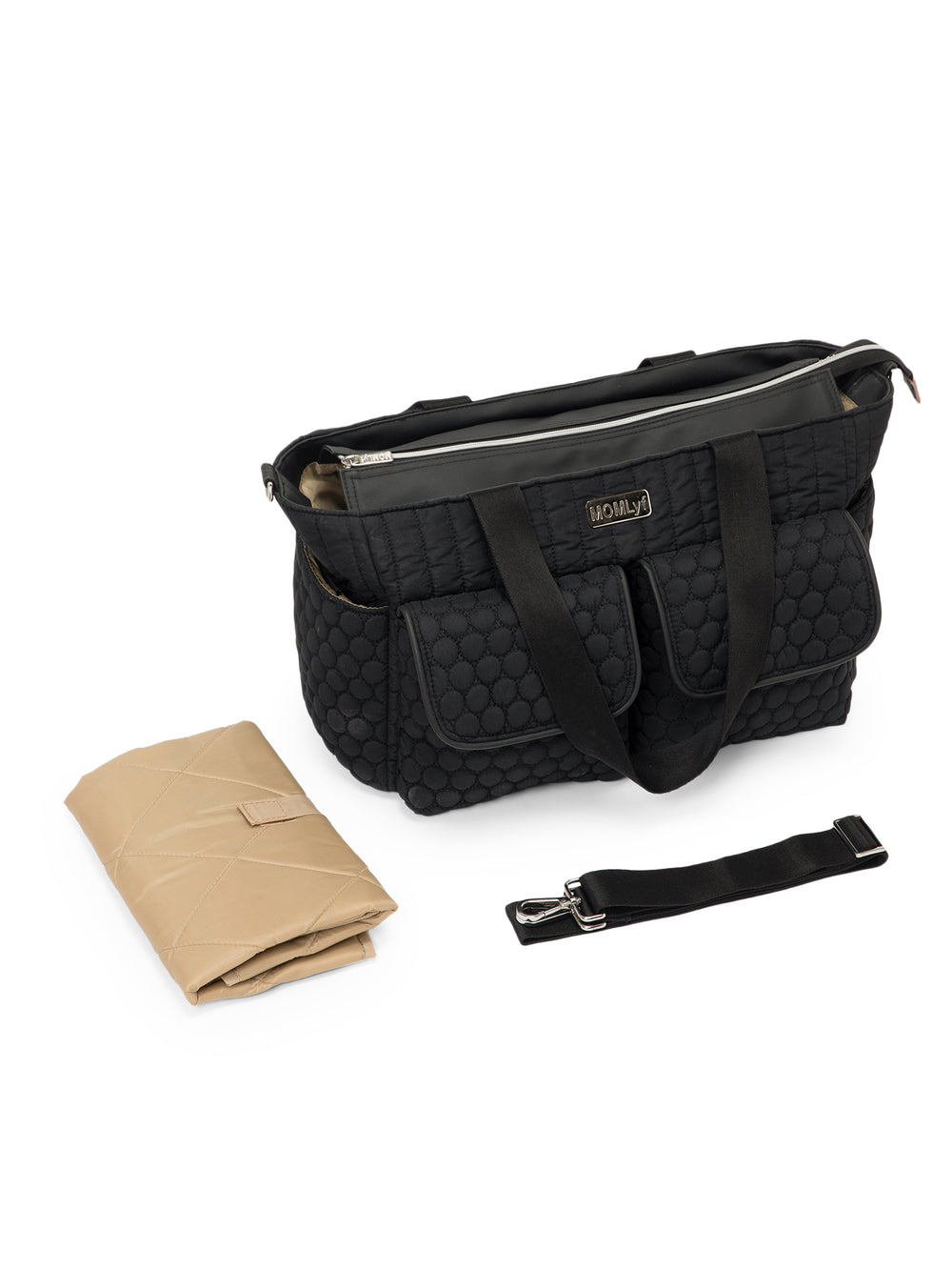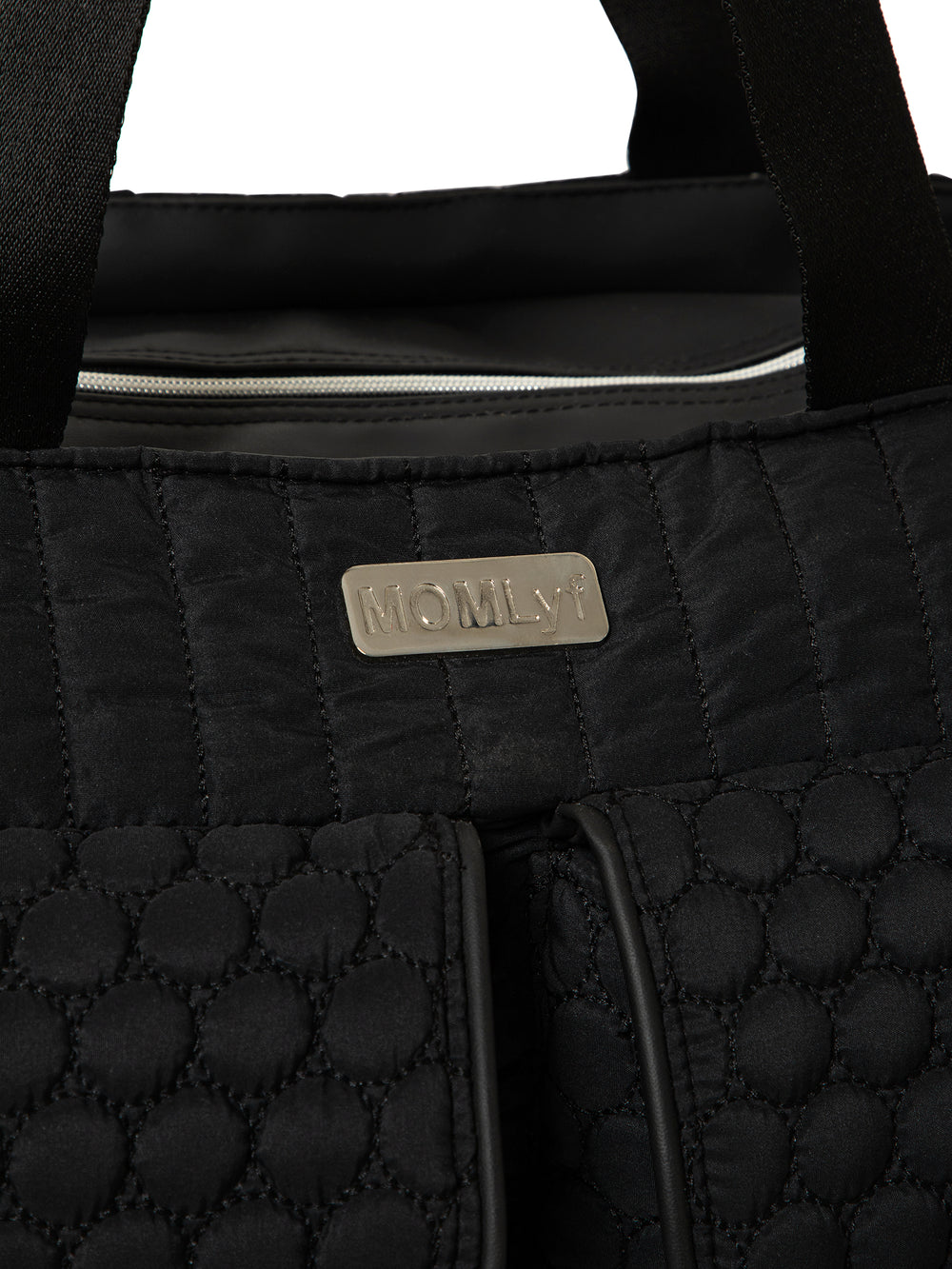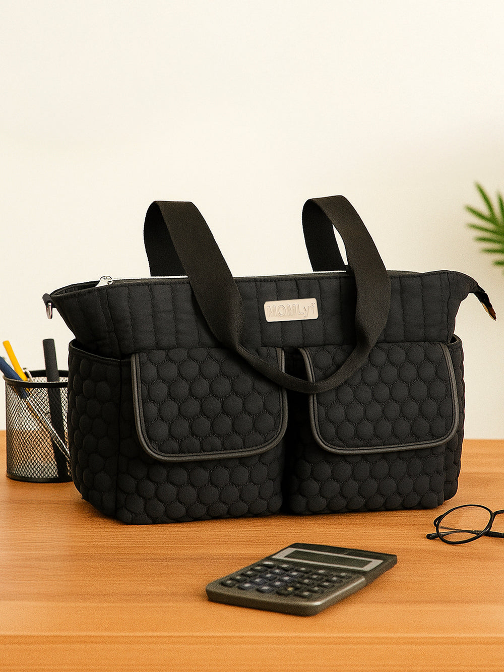 The MOMLyf Cavya Diaper Tote Bag is crafted from quilted polyester with vegan leather accents and webbing handles, finished in a sleek black finish with matching trims and silver hardware. Its dual quilt patterns, vertical channel quilting on the top and bubble quilting on the bottom, add a modern contrast to the design. Measuring 34 x 38 x 15 cm, it offers smart storage with a zip-secured main compartment, two inner slip pockets for milk bottles, two mesh pockets for bibs or snacks, and a large interior sleeve with a velcro closure for the included changing mat or a tablet/iPad. For quick access, the exterior features two small pockets with magnetic button closures, ideal for pacifiers, toys, creams, or other daily necessities. Dual side bottle holders enhance convenience, while a secure back zippered pocket keeps valuables safe. Designed for busy parents, it features two sturdy shoulder handles, a detachable adjustable sling strap, and a trolley strap for effortless travel, combining style with everyday functionality.