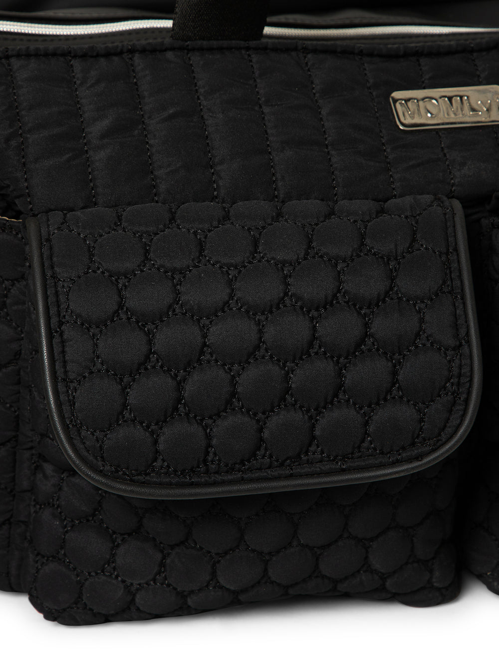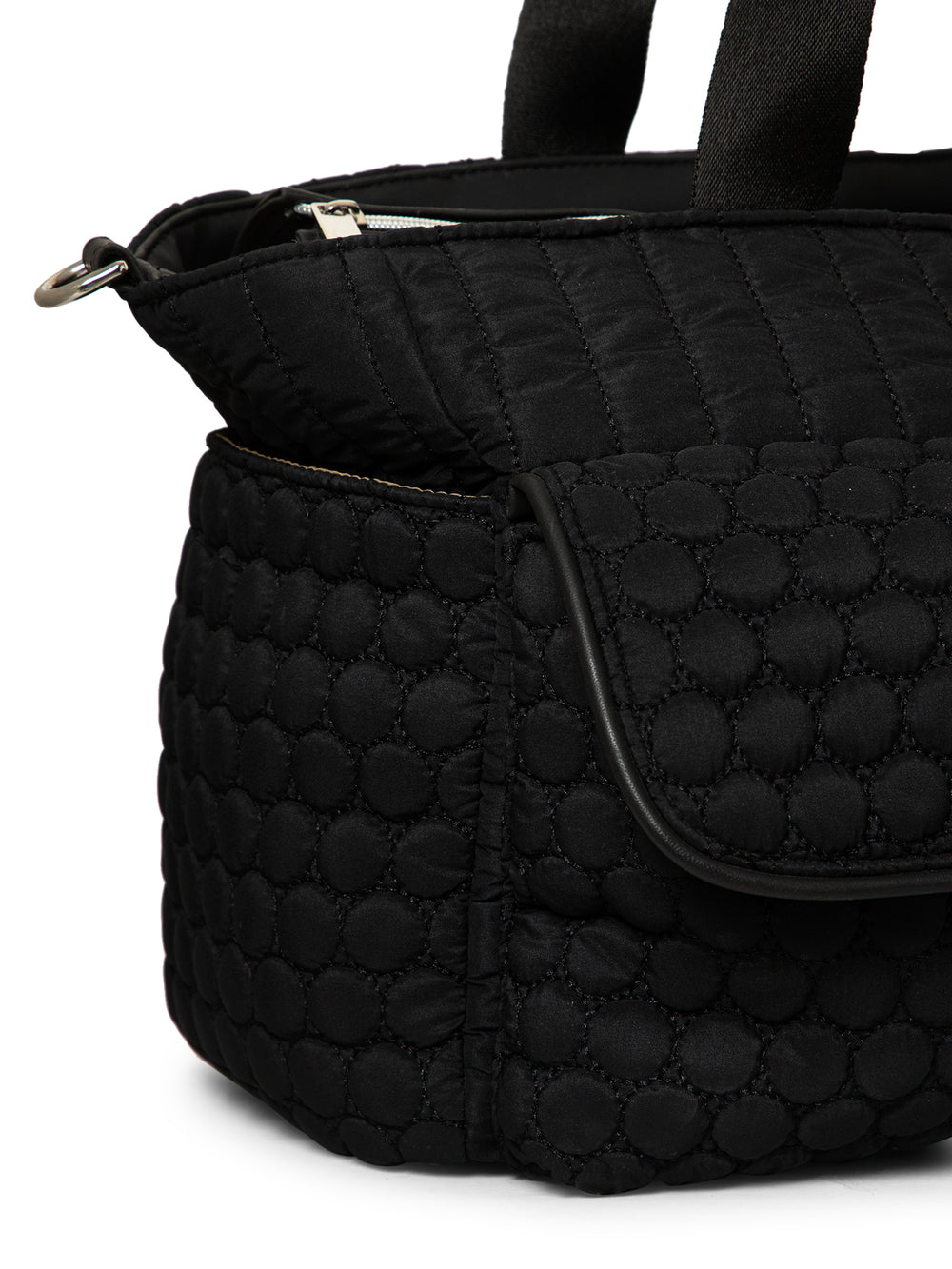 Crafted from a premium blend of polyester and vegan leather, this bag showcases a sleek black finish with matching trims and silver hardware. The striped and bubble quilting adds depth and a contemporary edge to its aesthetic.