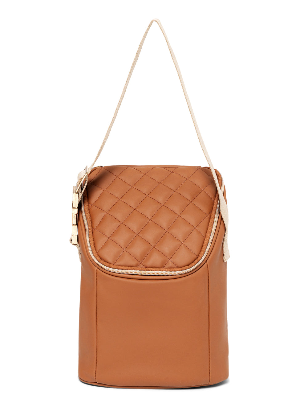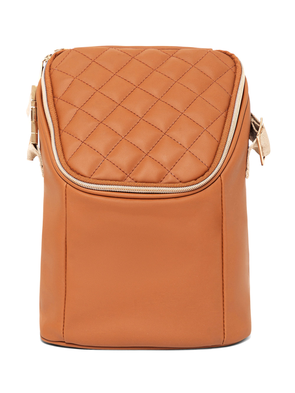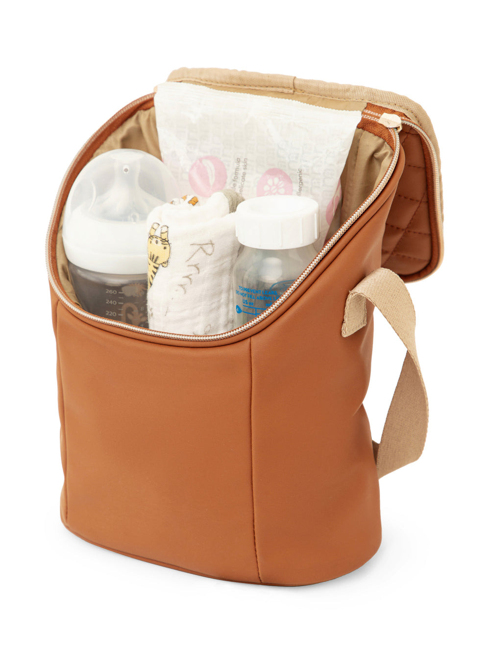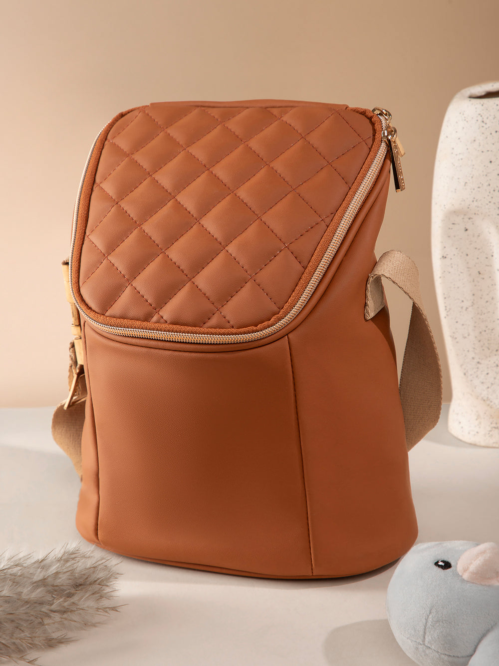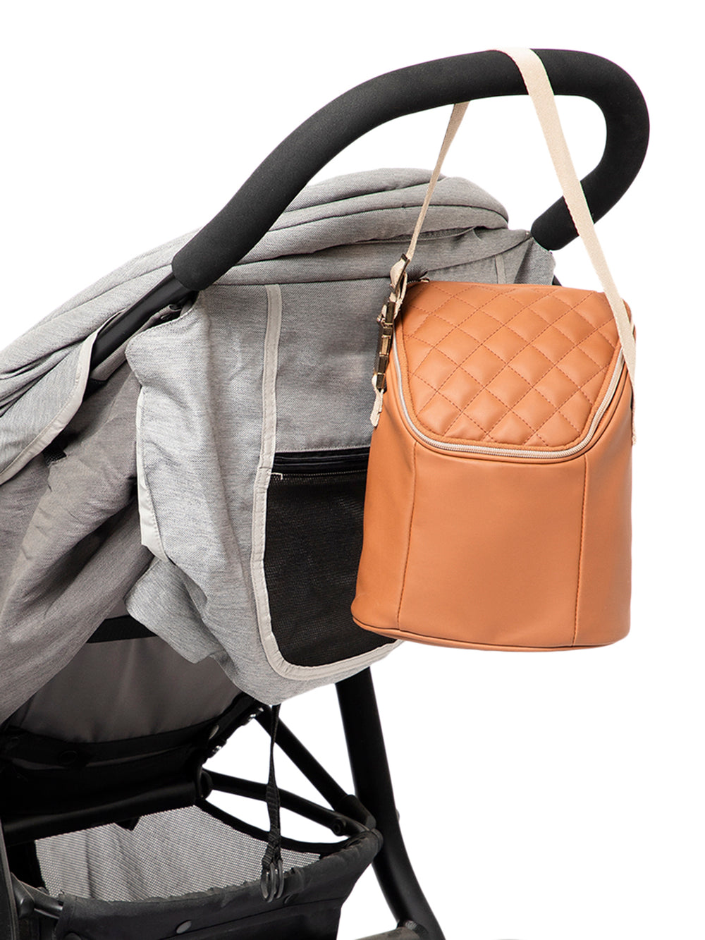 The MOMLyf Cubbii Handheld Bag in tan camel brown features a smooth vegan leather body with gold zip detailing for a polished look. A diamond-quilted flap adds texture and style, while an adjustable webbing handheld strap in beige ensures a coordinated finish. It includes an adjustable webbing handheld strap in matching blue for coordinated style. Measuring 20 x 24 x 9 cm, this compact bag is ideal for short trips and quick errands with your baby. It features a single main compartment secured with a zipper closure, offering ample space to carry essentials like a snack, small bottle, pacifiers, bibs, wipes etc. Inside, a built-in mesh pocket provides convenient storage for small items while on the go. Perfect for outings with your little one, this compact bag features an adjustable sling strap for hands-free carrying and attaches easily to strollers. It’s a smart alternative to bulky diaper bags, ideal for when you just need 2–3 essentials on the go for that short ride to the park or shopping centre.