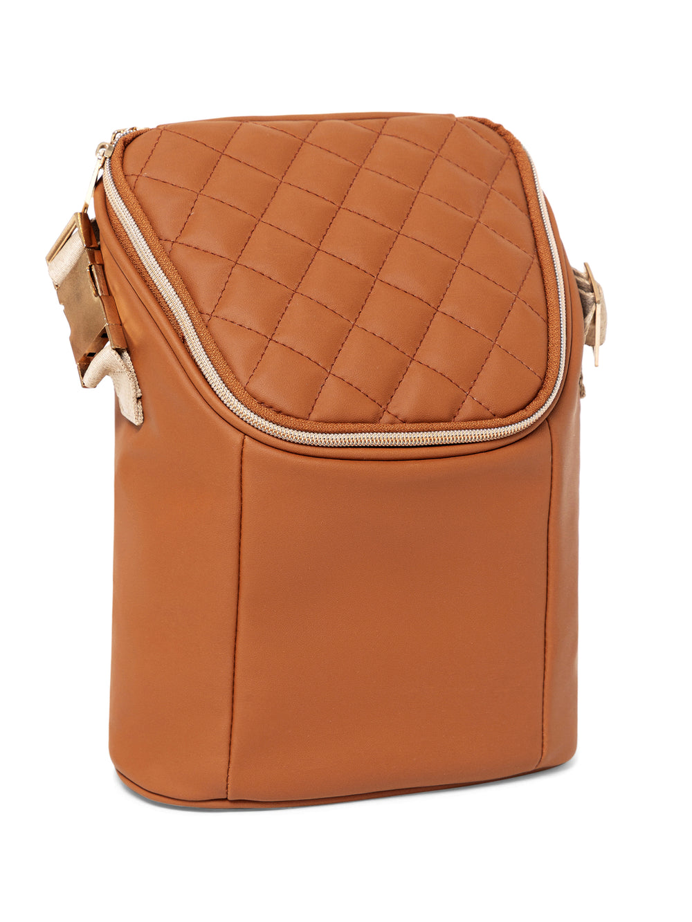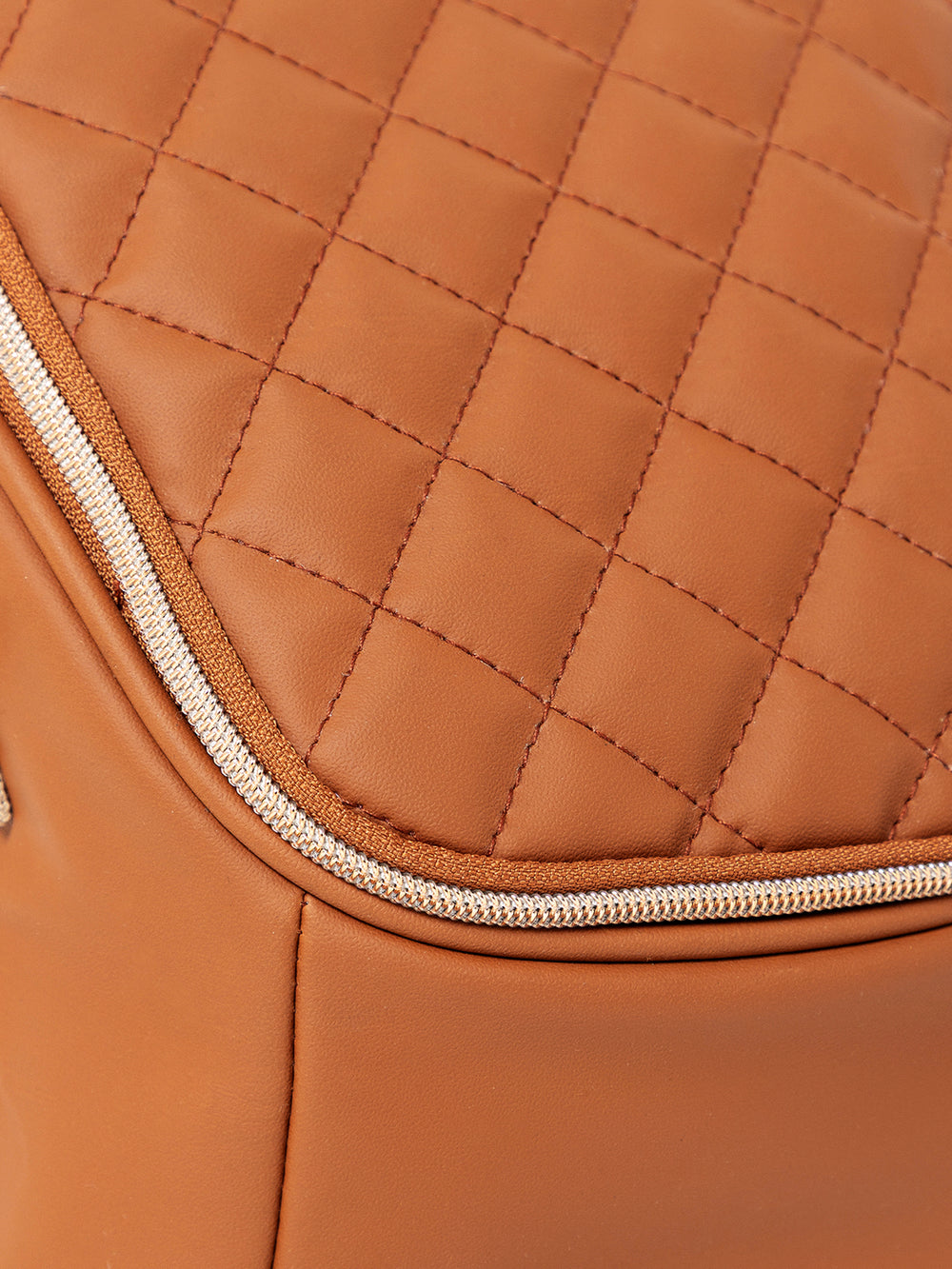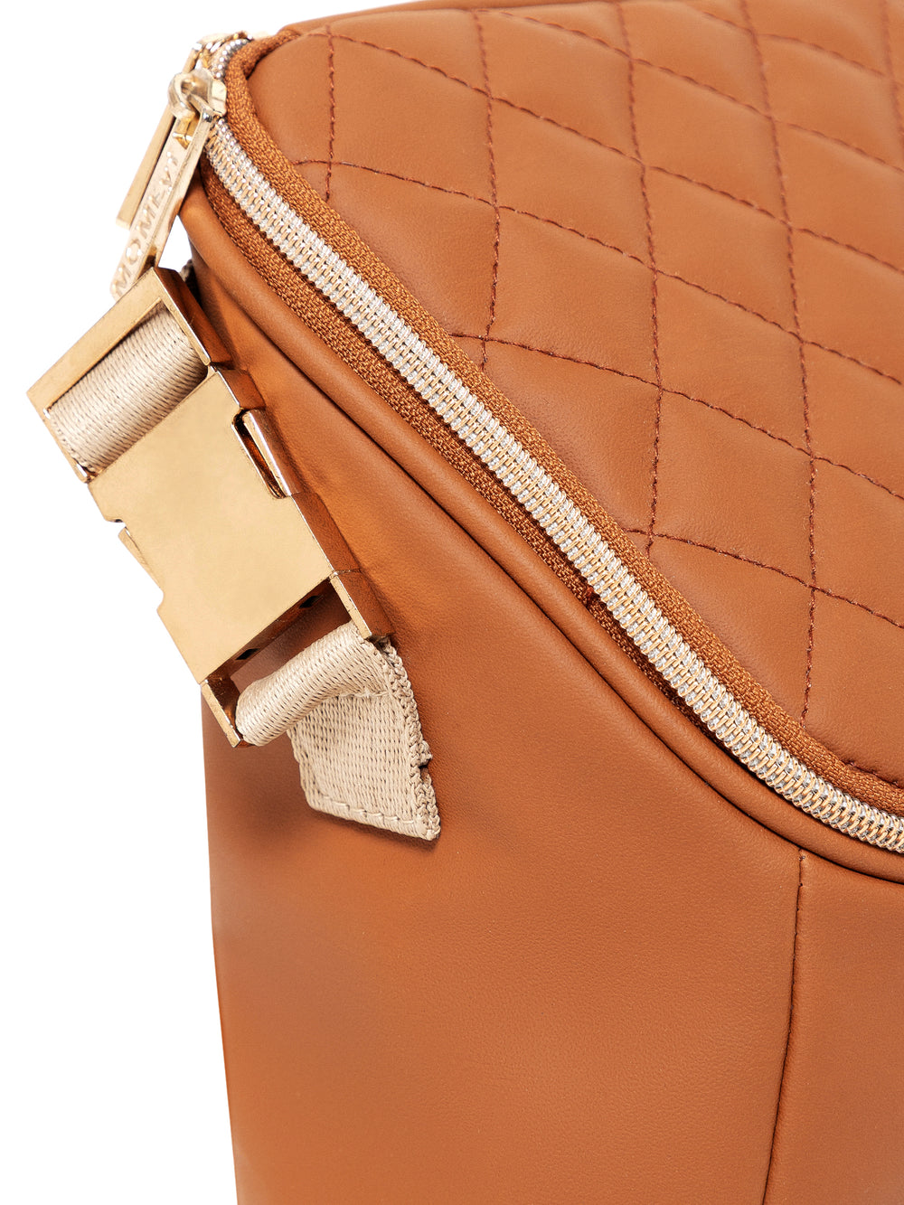 This bag features a Tan Camel Brown body with Gold zip detailing, crafted from vegan leather outer fabric for a polished look. It includes a diamond-quilted flap that adds texture and style, along with an adjustable webbing handheld strap in beige for a coordinated finish.