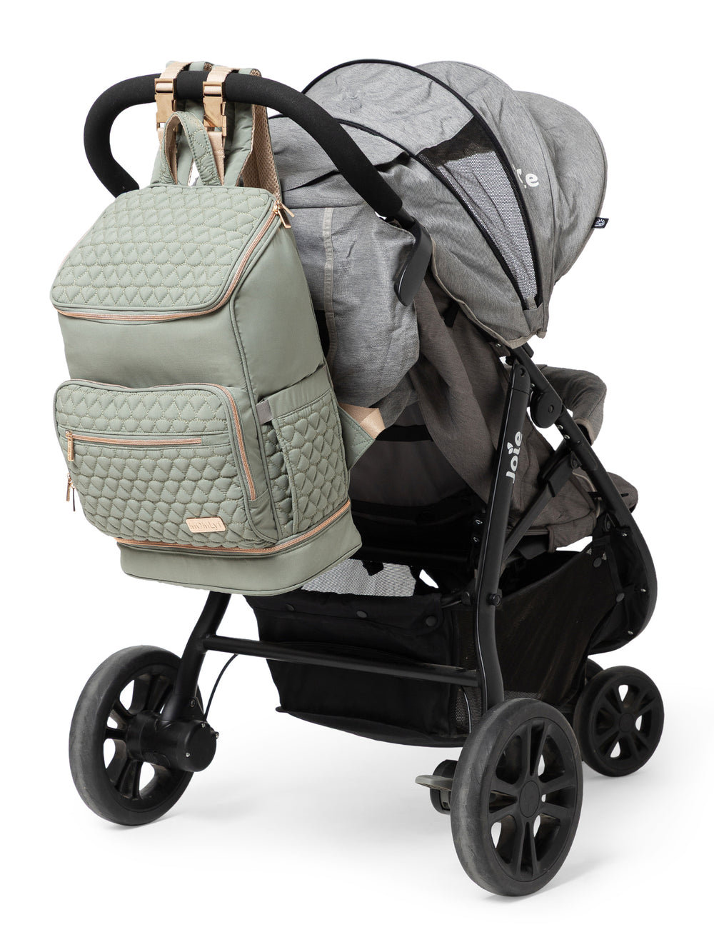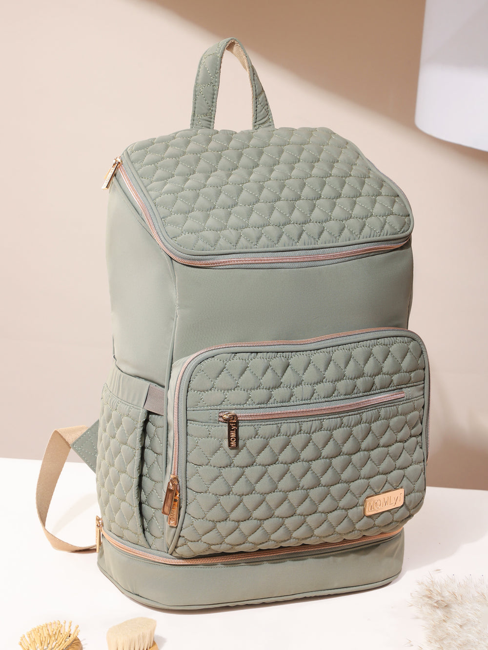 The MOMLyf Keera Diaper Backpack in sage green color features rose gold zipper accents and hardware, combining style with practicality. Crafted from smooth, premium polyester with a lightly padded texture for comfort and durability, it showcases droplet quilted stitching on the front pocket and flap for a structured, textured appearance. Measuring 32 x 39 x 15 cm, the spacious design includes a zippered main compartment with four inner slip pockets for diapers, wipes, and small essentials, plus a mesh pocket for the included changing mat. The exterior has a large front pocket with three slip pockets for milk bottles, a smaller zip pocket for bibs or wipes, a discrete zippered bottom compartment for extra storage, and two side bottle holders for quick access. Ideal for parents on the go, it offers a sturdy top handle for hanging, adjustable shoulder straps for comfort, stroller attachments for hands-free outings, and a built-in trolley strap to easily slide over luggage handles during travel.