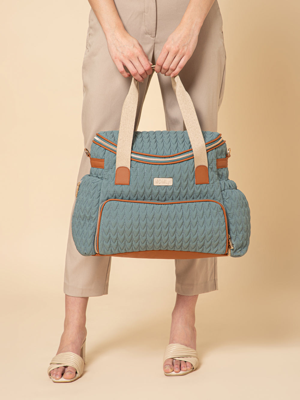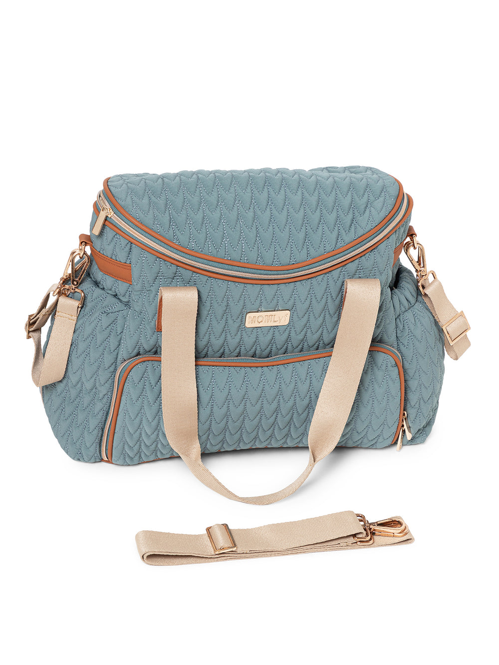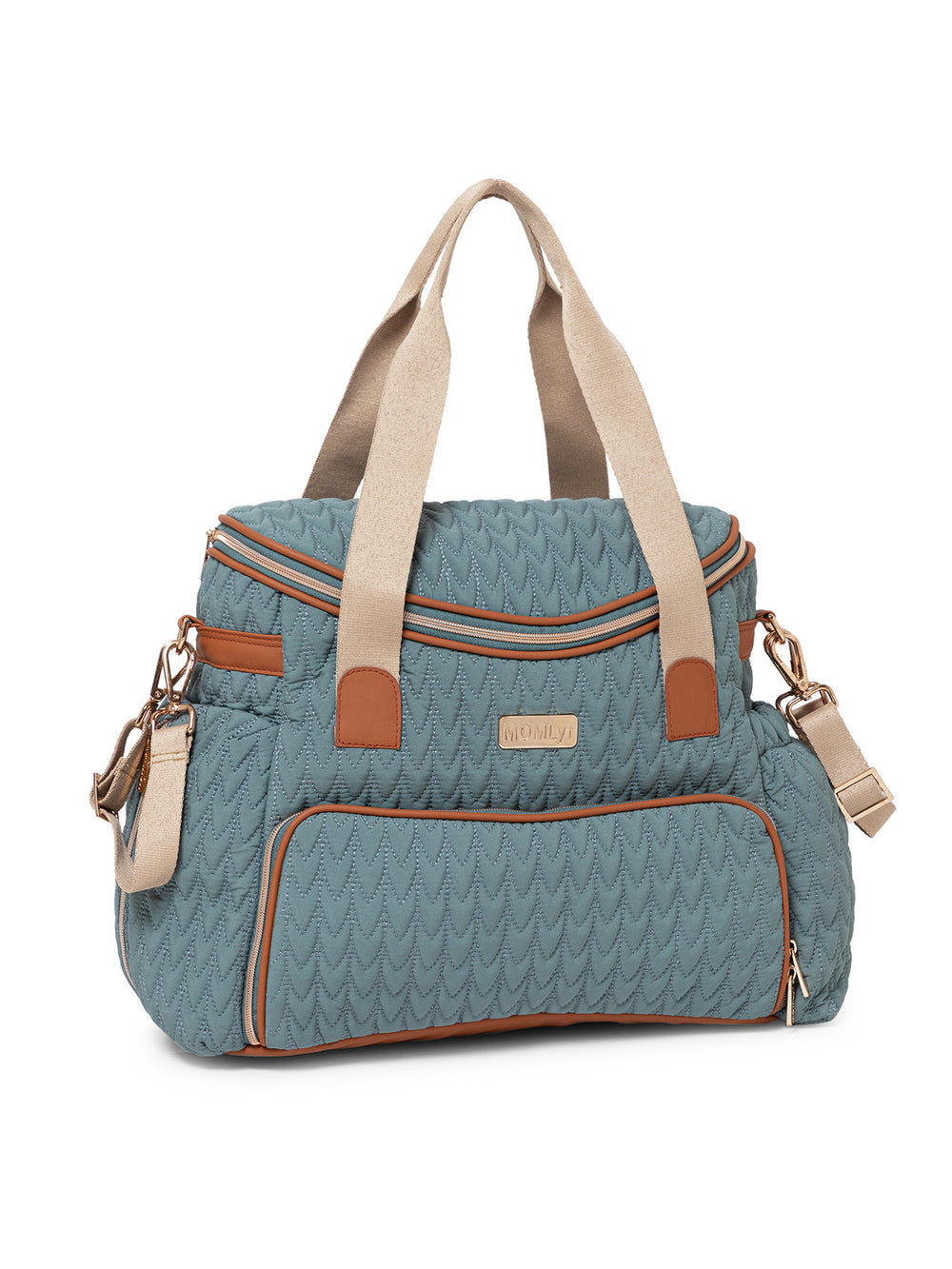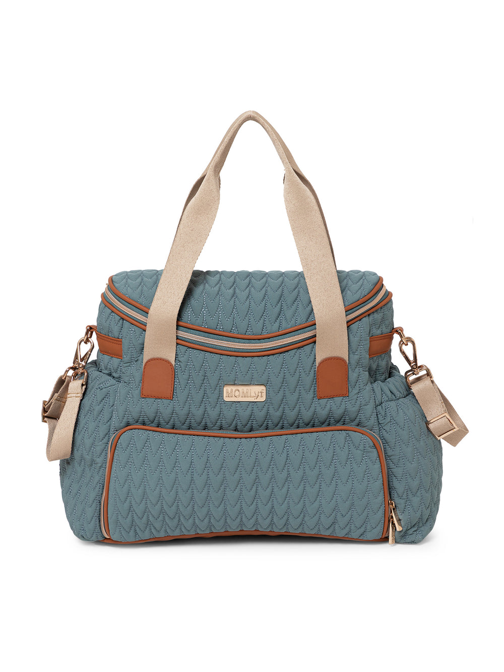 The MOMLyf Oruva Diaper Tote cum Sling Bag in dusty teal with tan accents combines style and practicality with a quilted polyester fabric featuring scallop stitching, vegan leather trims, and reinforced nylon webbing handles for durability and a luxe finish. It offers a spacious main compartment with two slip pockets, two mesh pockets, and three bottle holders (two inside for milk bottles and one on the exterior for regular water bottles). Additional storage includes a front zip pocket with a detachable roll-out changing mat, a side zip pocket designed specially for easy access to wipes, and a back zip pocket for valuables. Designed for convenience, it features sturdy top handles, a detachable adjustable sling strap, stroller attachments, and a trolley strap for easy travel. Dimensions: 38 x 25 x 17 cm.