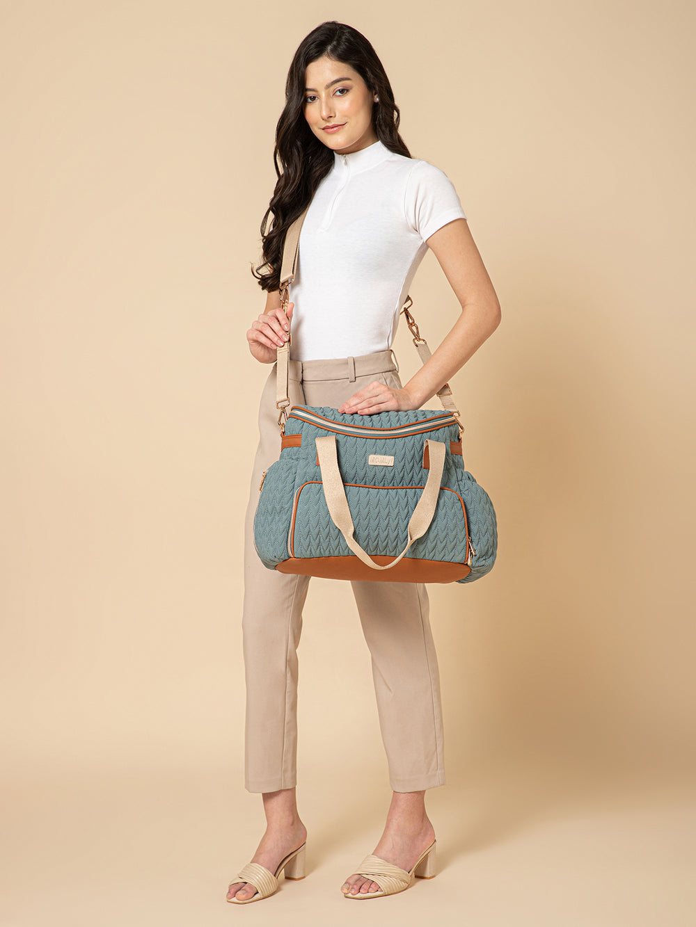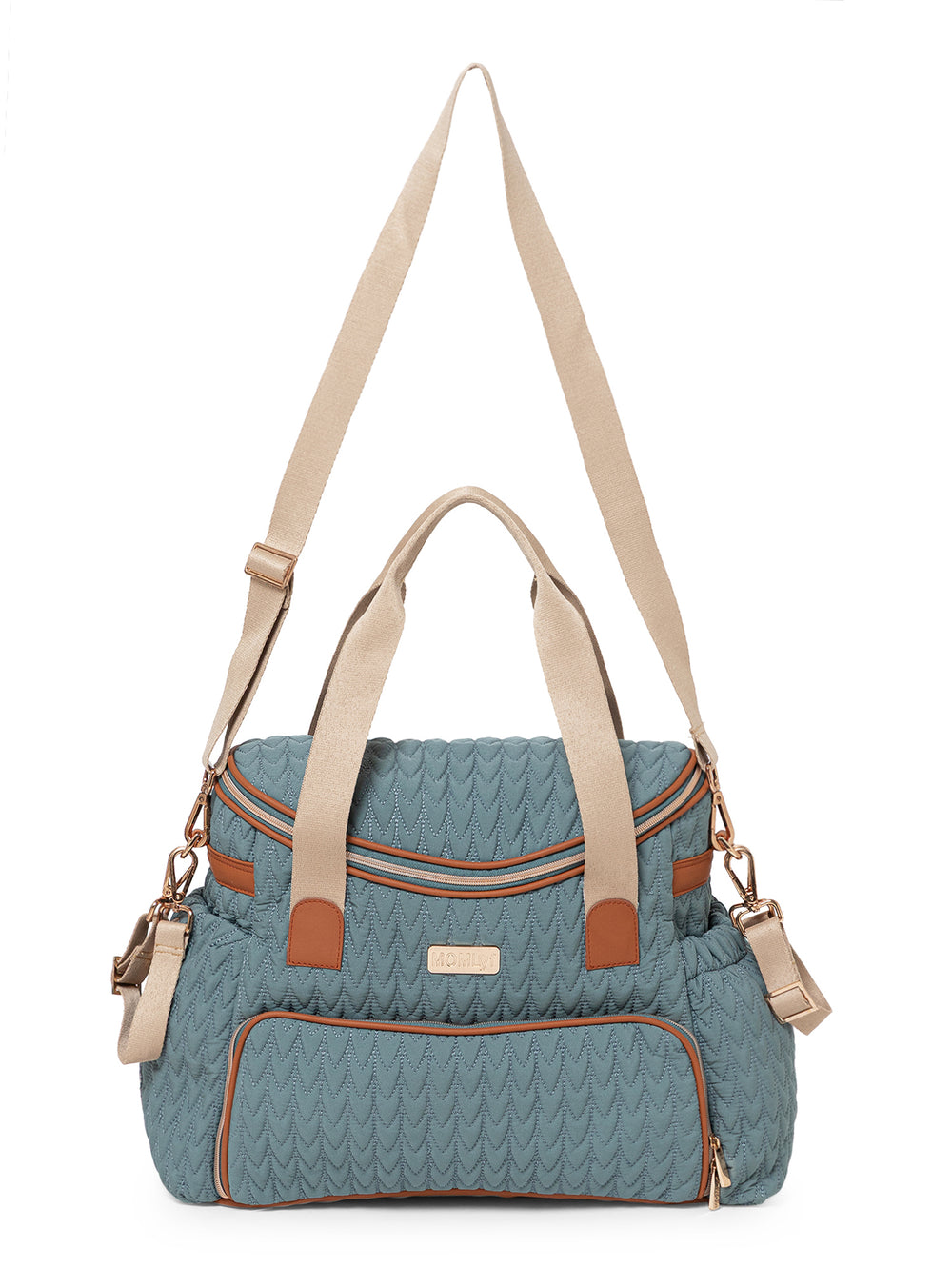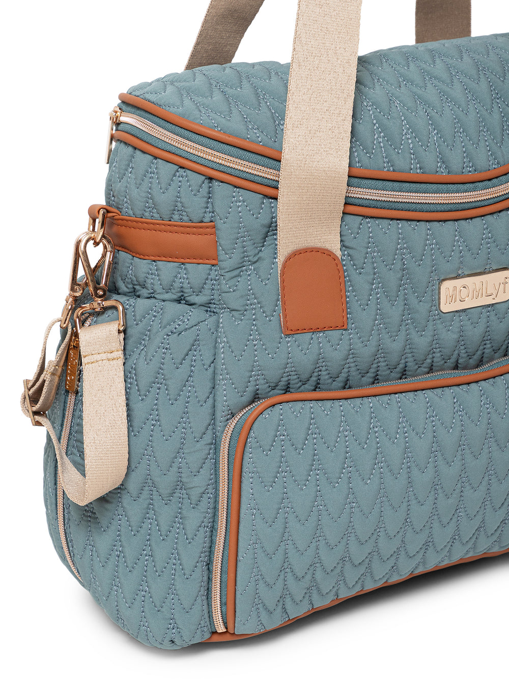 The MOMLyf Oruva Diaper Tote cum Sling Bag in dusty teal with tan accents combines style and practicality with a quilted polyester fabric featuring scallop stitching, vegan leather trims, and reinforced nylon webbing handles for durability and a luxe finish. It offers a spacious main compartment with two slip pockets, two mesh pockets, and three bottle holders (two inside for milk bottles and one on the exterior for regular water bottles). Additional storage includes a front zip pocket with a detachable roll-out changing mat, a side zip pocket designed specially for easy access to wipes, and a back zip pocket for valuables. Designed for convenience, it features sturdy top handles, a detachable adjustable sling strap, stroller attachments, and a trolley strap for easy travel. Dimensions: 38 x 25 x 17 cm.