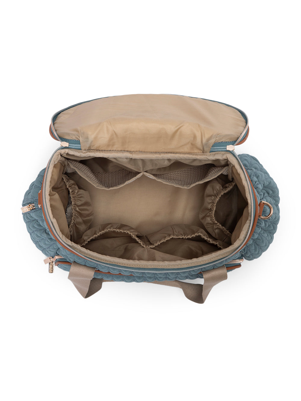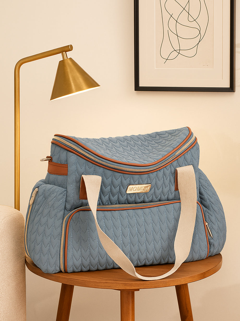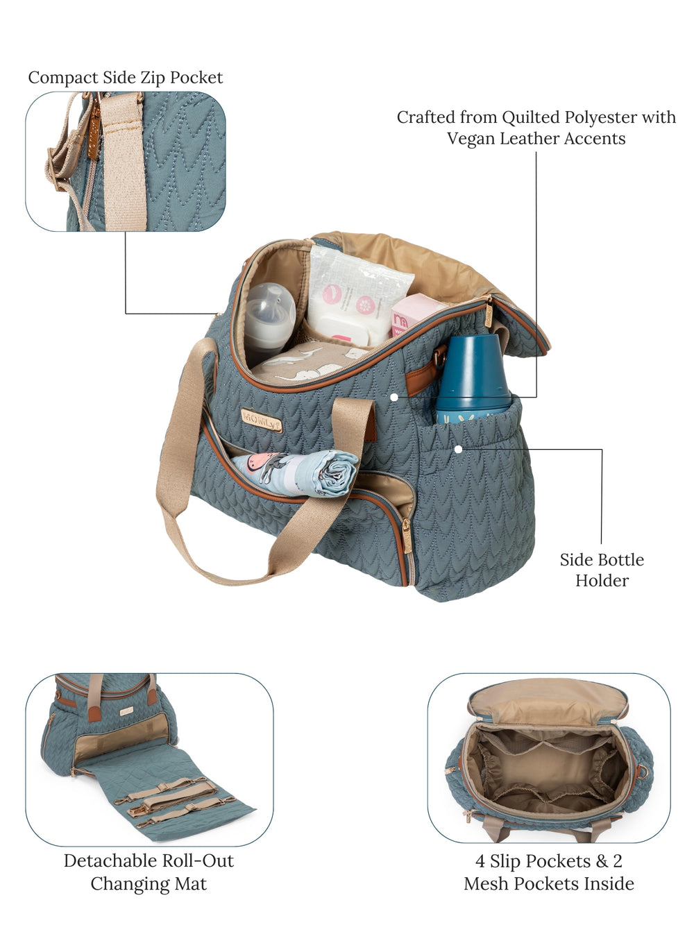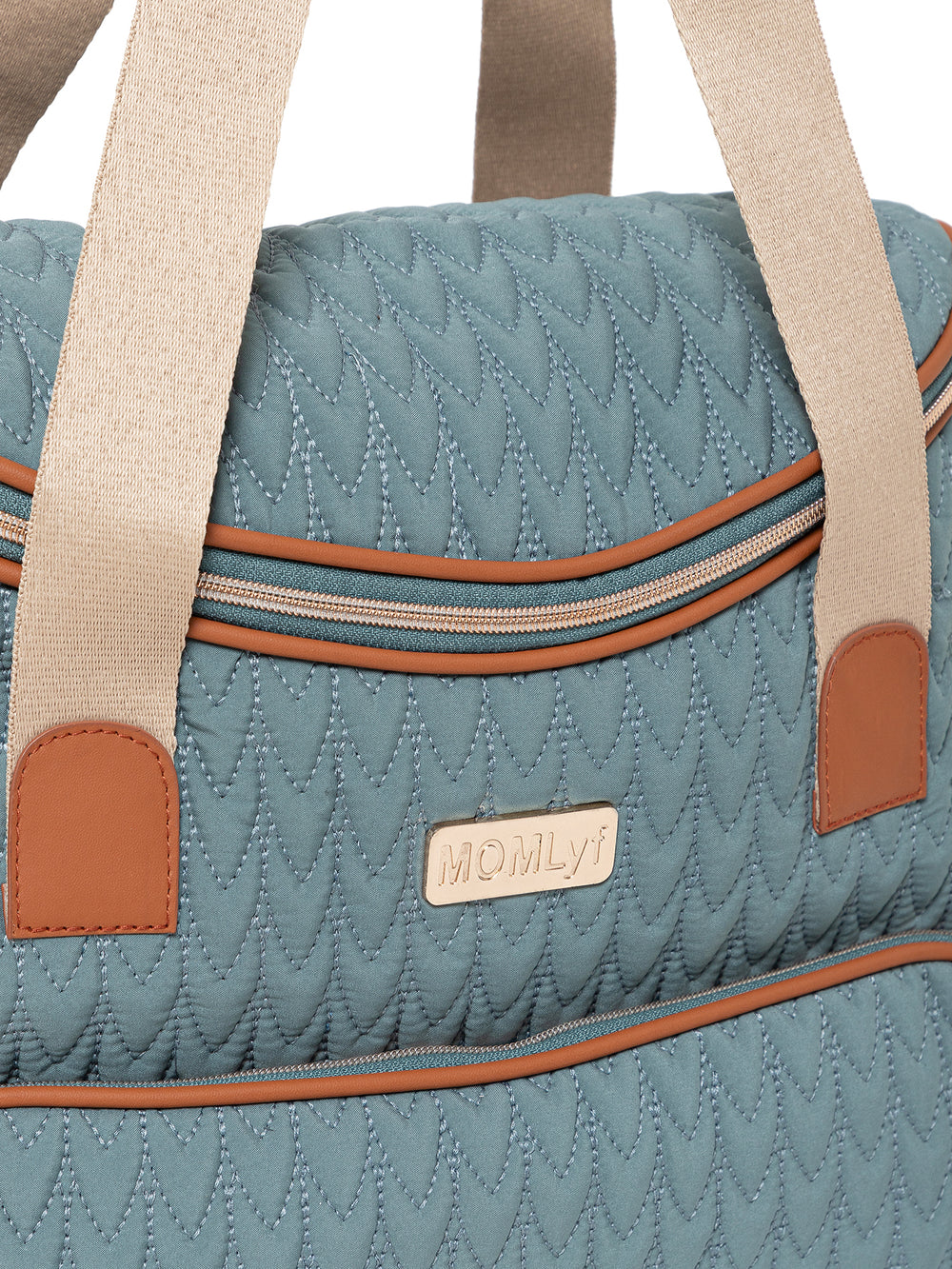 The MOMLyf Oruva Diaper Tote cum Sling Bag in dusty teal with tan accents combines style and practicality with a quilted polyester fabric featuring scallop stitching, vegan leather trims, and reinforced nylon webbing handles for durability and a luxe finish. It offers a spacious main compartment with two slip pockets, two mesh pockets, and three bottle holders (two inside for milk bottles and one on the exterior for regular water bottles). Additional storage includes a front zip pocket with a detachable roll-out changing mat, a side zip pocket designed specially for easy access to wipes, and a back zip pocket for valuables. Designed for convenience, it features sturdy top handles, a detachable adjustable sling strap, stroller attachments, and a trolley strap for easy travel. Dimensions: 38 x 25 x 17 cm.