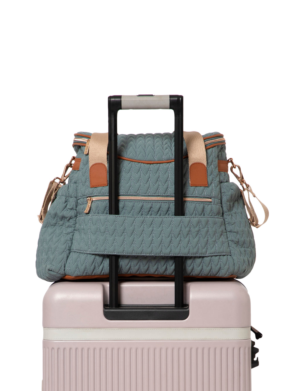 This bag features a sophisticated Teal Green and Tan color palette that combines contemporary style with timeless appeal. Expertly crafted from premium polyester and accented with durable vegan leather, it offers a refined finish and long-lasting performance. The exterior is enhanced by a distinctive chevron quilted pattern adding texture and visual interest for a polished, modern look.