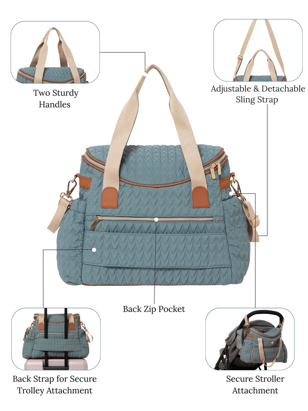 This stylish and functional bag is ideal for parents traveling with their baby. Designed with convenience in mind, it features sturdy top handles for easy carrying and a detachable, adjustable sling strap that allows for comfortable, hands-free use. The bag also includes special attachments that let it securely fasten to stroller handles, making outings with a baby more manageable. Additionally, the built-in trolley strap allows it to be easily attached to suitcase handles, making airport travel or long trips hassle-free.