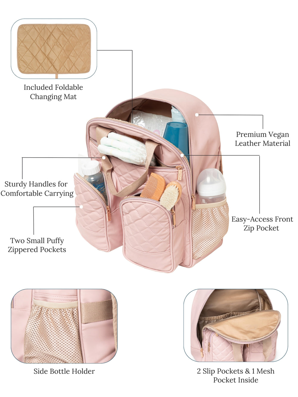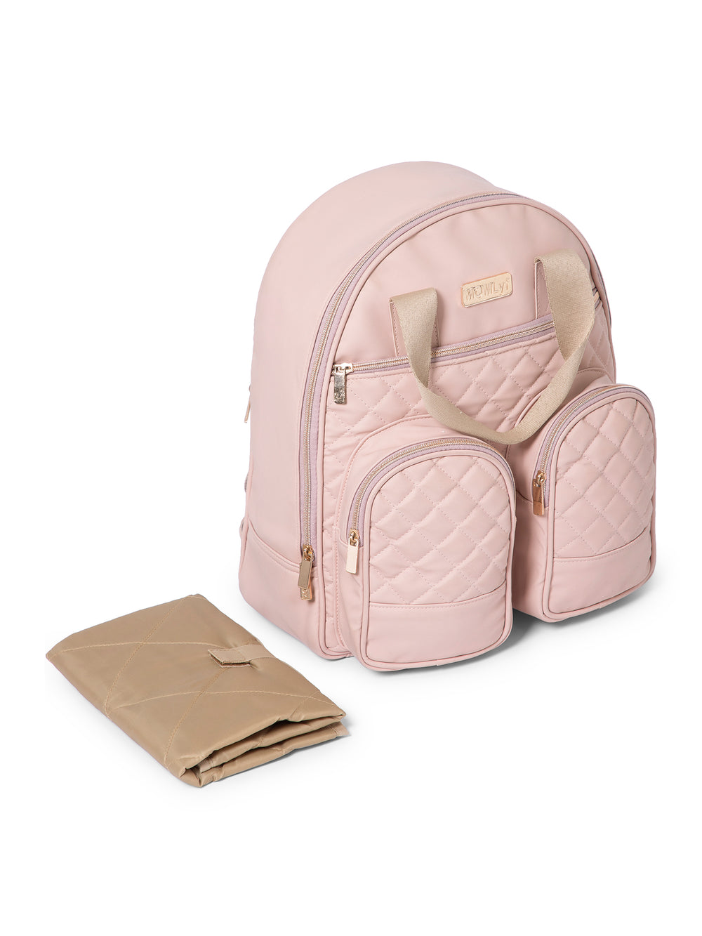 The MOMLyf Zivvy Diaper Backpack is crafted for modern parents who value both style and function. Designed in pastel pink with rose gold zipper accents and beige handles, it features a smooth vegan leather body with diamond-quilted front panels. Measuring 32 x 39 x 15 cm, it includes a spacious main compartment with zip closure, two inner slip pockets and a mesh slot for the included changing mat. One large front zipper pocket and two small puffy zippered pockets for easy access, a hidden back pocket for valuables, and a dedicated bottle holder. For on-the-go ease, it comes with double top handles, padded adjustable shoulder straps, stroller-attachable buckles, a trolley strap for luggage, and a foldable changing mat. Lightweight, organized, and travel-ready, this backpack covers all your parenting needs in one smart design.